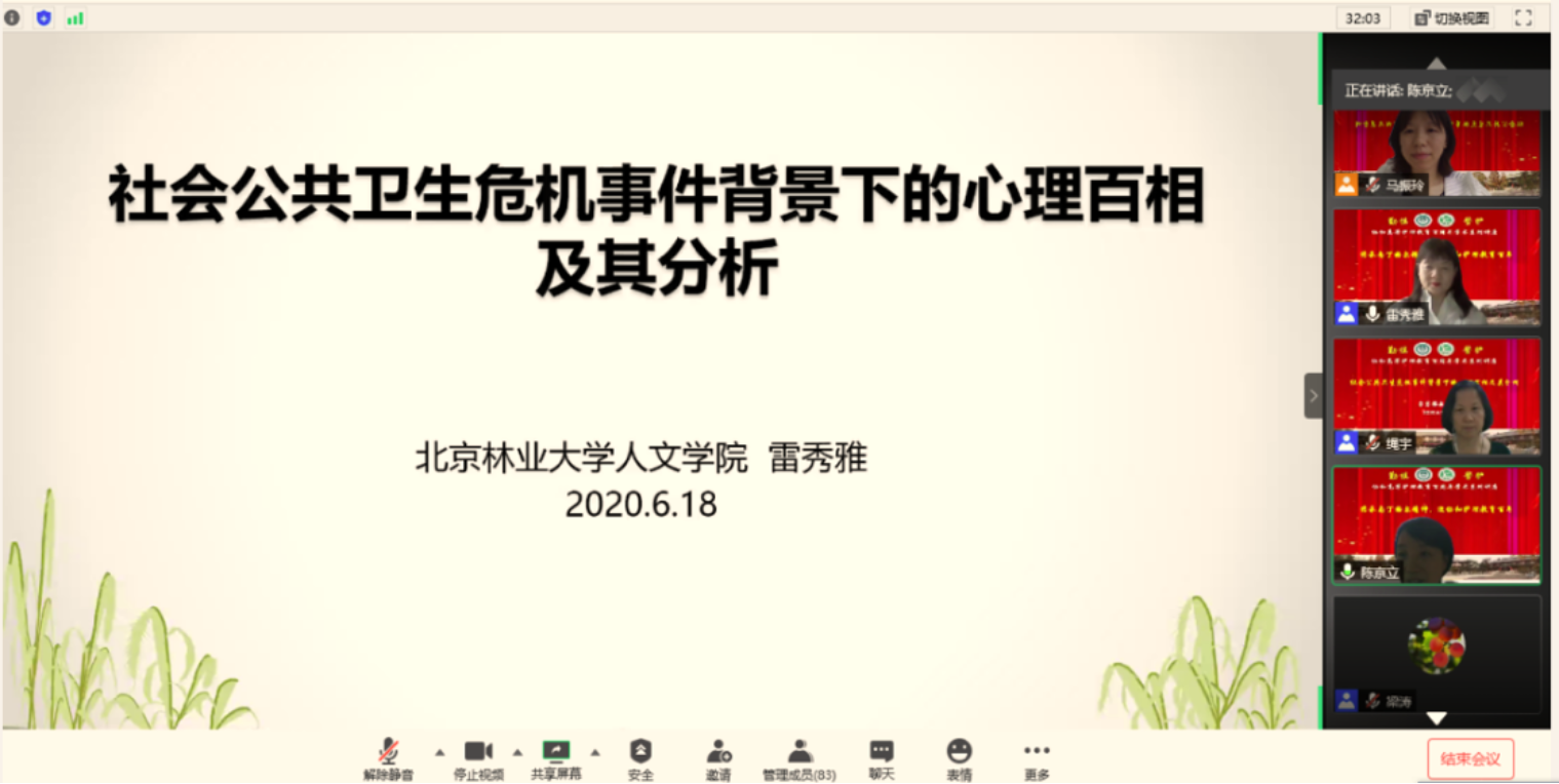 2020年6月18日下午13:30,受BB贝博艾弗森官方网站基础护理学系邀请,北京林业大学人文学院的雷秀雅教授为BB贝博艾弗森官方网站的师生进行了线上《社会公共卫生危机事件背景下的心理百相及其分析》的专题讲座,学院陈京立书记、各学系主任以及全体教师、研究生和本科生约90人参加了此次学习。这也是协和护理教育百年庆典系列讲座之一,雷秀雅教授的精彩报告让我们对社会公共卫生事件对人们心理的影响以及该如何应对有了深刻认识,尤其在当前新冠疫情防控阶段,报告内容不仅有助于学院师生认识和处理疫情下自己的心理现象,也对大家今后更深入地开展心理护理研究和临床实践工作具有重要的参考价值。